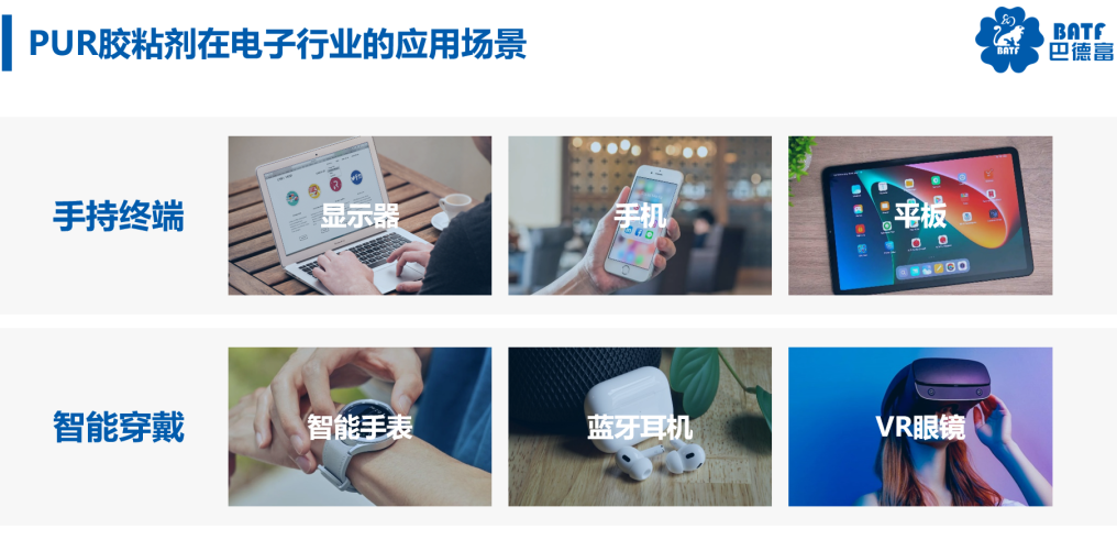 此外,巴德富PUR產品還可廣泛應用于電子行業(yè),如手持終端屏幕貼合、智能穿戴設備封裝等,及汽車行業(yè)的內飾件、后備胎蓋板、電子顯示屏等關鍵部位,提供高可靠性的粘接保障。